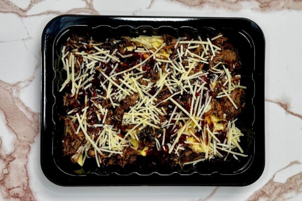Indulge in high-protein chickpea mac n cheese topped with smoky, tender turkey thigh burnt ends and a sprinkle of shredded parmesan cheese. Drizzled with a sugar free BBQ sauce, this dish combines bold, satisfying flavors with a nutritious twist.