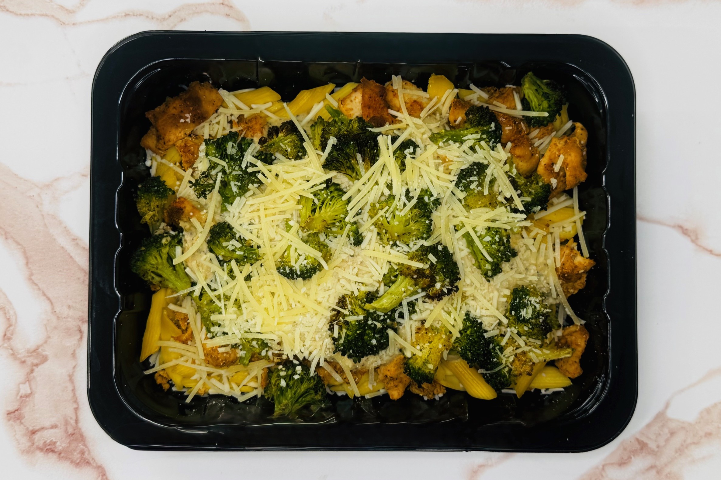 Chicken Breast, Banza Chickpea Penne Pasta, House-Made Alfredo Sauce, Broccoli, Shredded Parmesan cheese