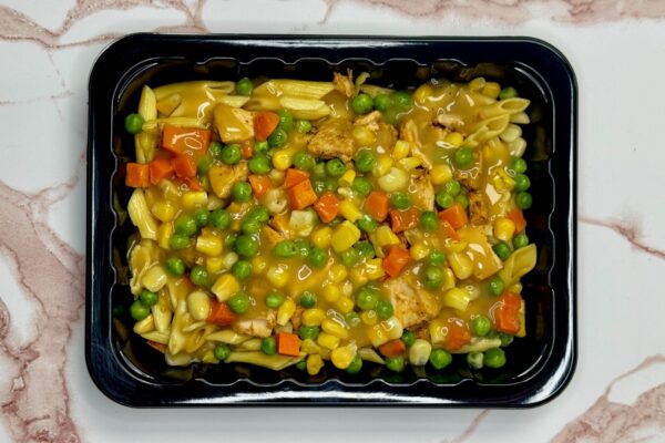 Chickpea banza pasta provide a hearty and protein-packed base, topped with tender marinated grilled chicken breast and a colorful medley of carrots, peas, and corn. Finished with a rich, savory gravy, this dish combines wholesome ingredients for a satisfying and flavorful meal