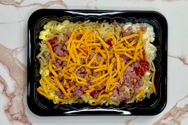 Hashbrowns, Scrambled Eggs, Egg Whites, Diced Ham, Sharp Cheddar Cheese, Sugar Free Ketchup