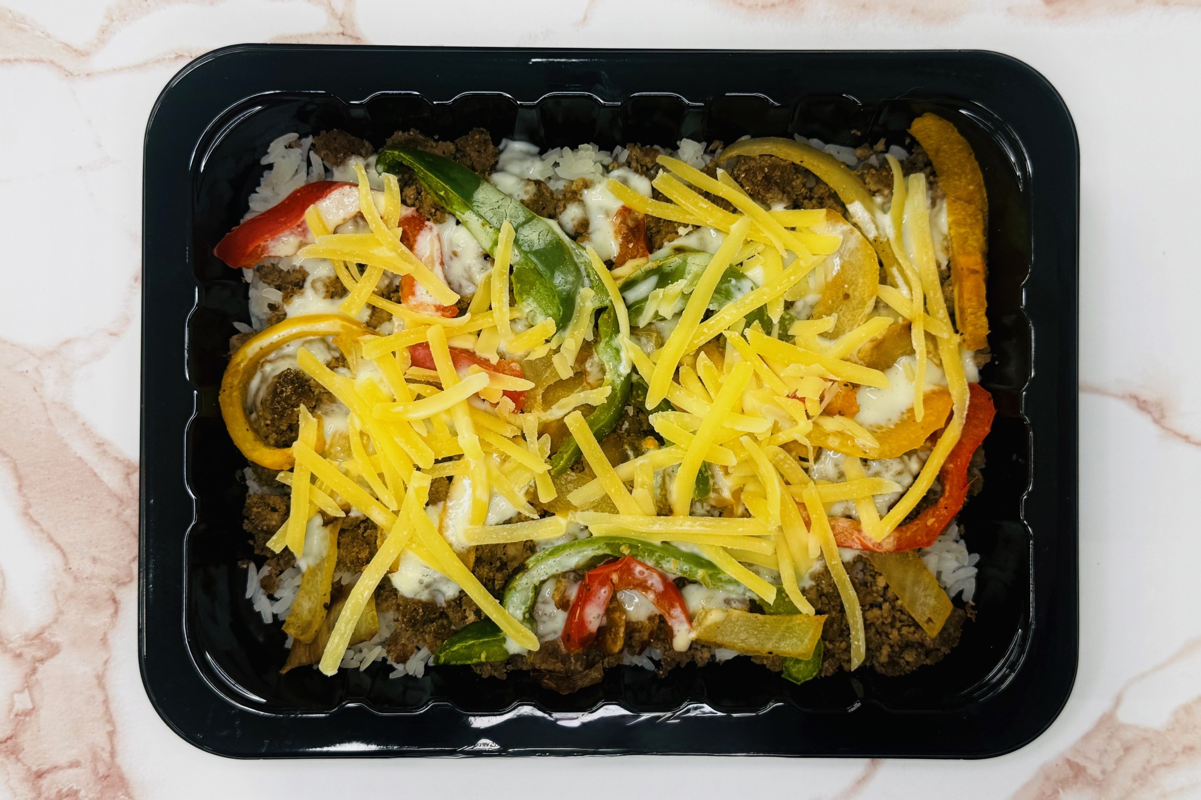 Jasmine rice, Lean ground beef, Bell Peppers, Onions, Shredded Swiss Cheese, House Made Queso Sauce
