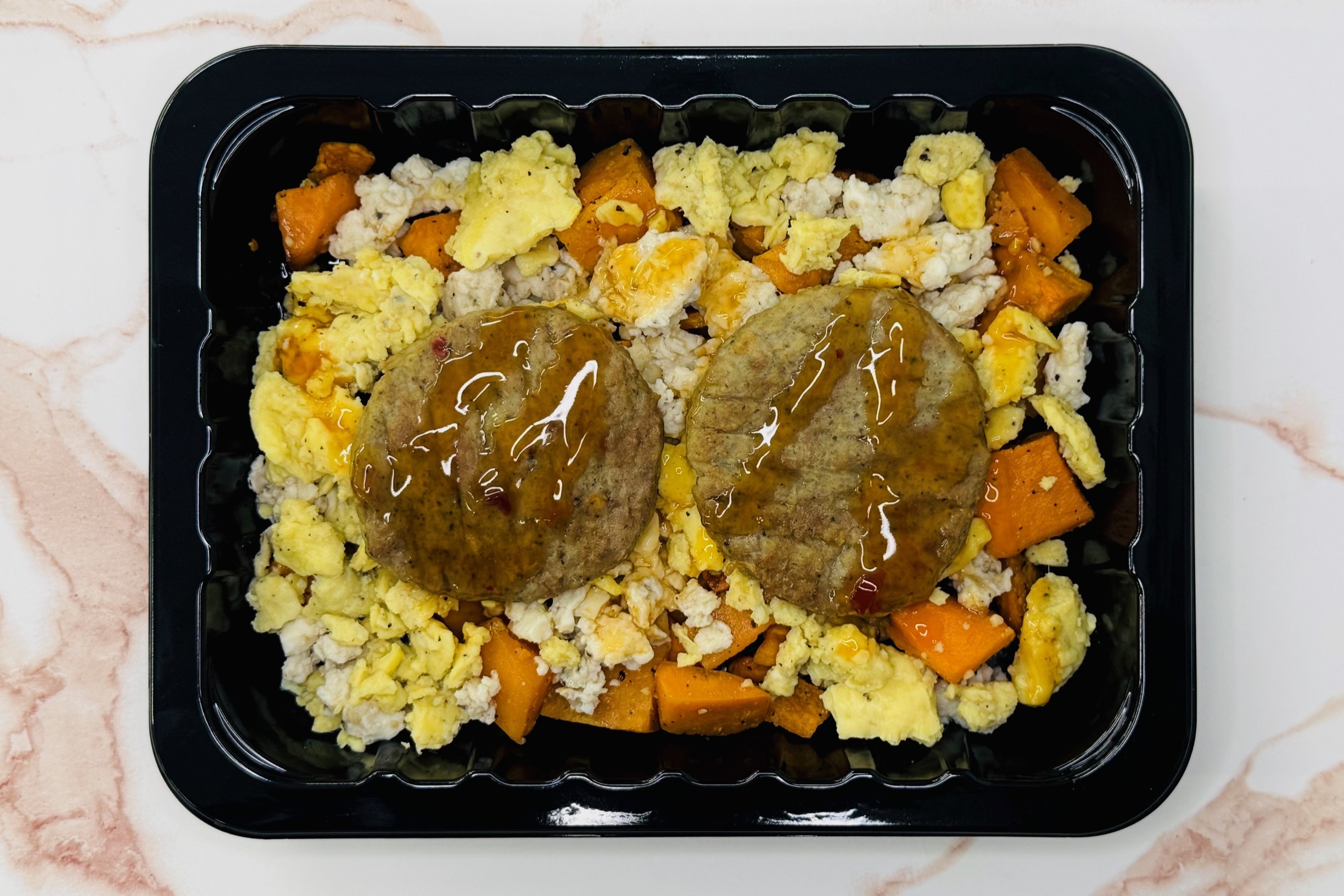 Sweet Potatoes, Amylu Organic Chicken Sausage Patties, Whole Eggs, Egg Whites, Hot Honey Sauce