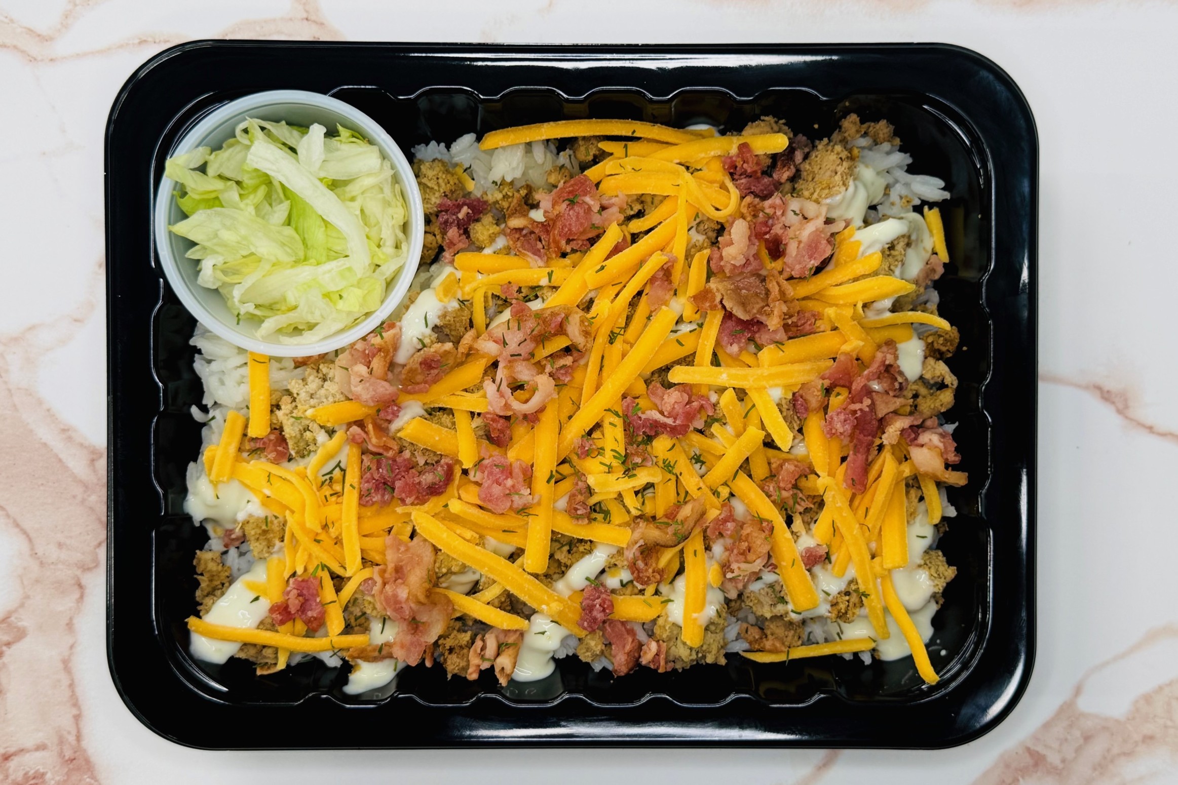 Jasmine Rice, Seasoned Lean Ground Turkey, Sharp Cheddar Cheese, Bacon Bits, Housemade Ranch