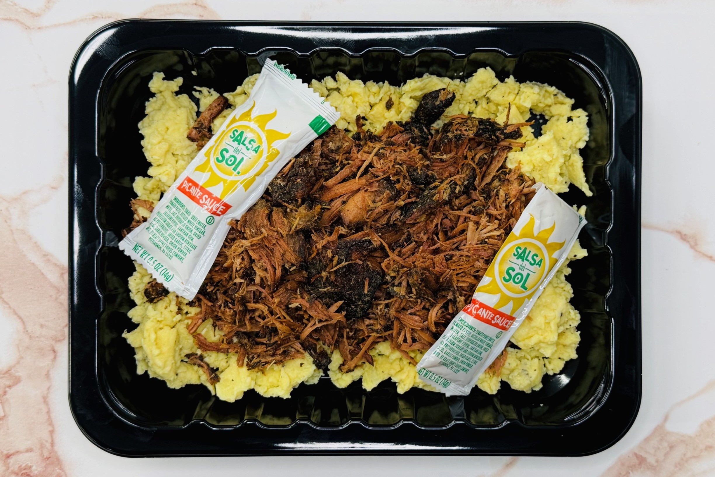 Smoked Turkey Thigh Burnt Ends, Scrambled Eggs, Picante Packets